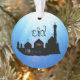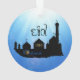 Schwarze Silhouette einer Moschee am blauen Himmel mit Sonne und Sonnenstrahlen, Grüße und Wünsche für Eid.