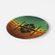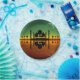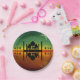 Eid Mubarak Grußbild: eine Moschee und Palmen Silhouette auf einem Nachthimmel Hintergrund mit dem Mond und Sternen reflektieren auf Wasser.