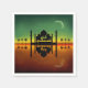 Eid Mubarak Grußbild: eine Moschee und Palmen Silhouette auf einem Nachthimmel Hintergrund mit dem Mond und Sternen reflektieren auf Wasser.