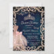 A modern, chic and glamorous invitation with an elegant gold tiara, dress, Eiffel Tower, and glitter butterflies on a blue background.