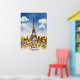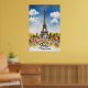 Ein Aquarellbild des Eiffelturms in Paris, Frankreich, umgeben von bunten Blume, unter einem blauen Himmel mit flauschigen Wolken.
