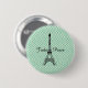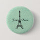Einfach niedlicher und eleganter Knopf mit schwarzem Eiffelturm Paris auf grün gepunkteten Mustern. Text: "J'adore Paris". Erstellt mit einem Lächeln von iolantesdesigns :-)!