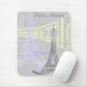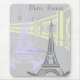 Grauer Hintergrund mit einigen Bildern des Eiffelturms in Gelbem, in Blauem, in hellem und in dunkelgrauem. Auch einige Bilder der Wörter "Paris, Frankreich" in den verschiedenen Größen und in den Farben.
