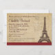 Beginnen Sie mit einem romantischen Pariser Brautparty mit einer einzigartigen Einladung, die wie eine Postkarte aus vergangener Zeit aussehen soll. Der Hintergrund erinnert an einen alten Brief mit subtilen Gravierungen, kursiver Handschrift und Visa-und Porto-Briefmarke. Der Eiffelturm dominiert auf einer Mondplatte. Der Papierhintergrund wird auf der Rückseite wiederholt, um zusätzliche Informationen für Ihre Gäste zu markieren. Verfügbar mit passenden Produkten.