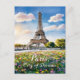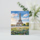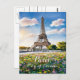 Ein malerischer Blick auf den Eiffelturm in Paris, Frankreich, mit einem lebendigen Feld in der Blume im Vordergrund und einem wunderschönen Sonnenaufgang. Der Turm steht hoch vor einem Hintergrund flauschiger Wolken und schafft eine magische und romantische Szene
