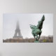 Top of the Eiffel Tower verloren im Nebel mit Bir-hakeim Statue La France Renaissante im Vordergrund - Paris, Frankreich