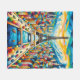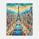 Das Bild ist ein lebendiges Gemälde von Paris, in dessen Mitte der berühmte Eiffelturm steht. Um den Turm herum gibt es mehrere Gebäude und die Seine fließt durch die Szene. Bemerkenswert sind die zahlreichen Brücken, die den Fluss überqueren, und die Verwendung von kühnen und lebhaften Farben zur Darstellung der Wasserstraßen, die verschiedene Boote enthalten. Bäume erscheinen in verschiedenen Bereichen rund um den Turm und vor den Gebäude, was zu dem reichen Farbschema des Gemäldes beiträgt. Die Perspektive vermittelt einen dreidimensionalen Sinn, indem sie einen 3/4 rechten Winkel benutzt, um die Tiefe und den Realismus des Gemäldes zu verbessern.
