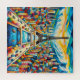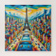 Das Bild ist ein lebendiges Gemälde von Paris, in dessen Mitte der berühmte Eiffelturm steht. Um den Turm herum gibt es mehrere Gebäude und die Seine fließt durch die Szene. Bemerkenswert sind die zahlreichen Brücken, die den Fluss überqueren, und die Verwendung von kühnen und lebhaften Farben zur Darstellung der Wasserstraßen, die verschiedene Boote enthalten. Bäume erscheinen in verschiedenen Bereichen rund um den Turm und vor den Gebäude, was zu dem reichen Farbschema des Gemäldes beiträgt. Die Perspektive vermittelt einen dreidimensionalen Sinn, indem sie einen 3/4 rechten Winkel benutzt, um die Tiefe und den Realismus des Gemäldes zu verbessern.