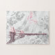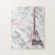 Eiffelturm vor dem Hintergrund der Orchideen. Grau, rosa Hintergrund.