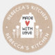 Ein personalisierter Aufkleber "made with Liebe" mit einem niedlichen kleinen Haus mit rotem Herz und den Worten, mit Liebe auf kraftfarbenem Hintergrund. Personalisieren Sie es, indem Sie Ihren eigenen Namen hinzufügen. Eine hübsche Touch für all Ihre hausgemachten Geschenke. Entworfen für Sie von BlackBerry Boulevard.