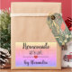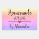 Moderner rechteckiger Aufkleber "hausgemacht mit Liebe" mit einem schwarzen Schriftart auf einem Glitzer mit Regenbogen, der durch ein niedliches Herz geschmückt ist. Text anpassen.