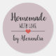 Moderner Aufkleber "hausgemacht mit Liebe" mit schwarzem Schriftart auf lila Hintergrund, geschmückt mit niedlichem rotem Herz. Text anpassen.