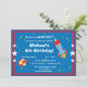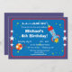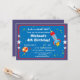 Diese lustige Geburtstagsfeier Einladung beinhaltet ein Raketenschiff und einen Polka-Dot-Planeten auf einem blauen Weltraum-Hintergrund mit Sternen. Vollständig anpassbar.