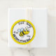 Eine fröhliche Biene steht in der Mitte dieses Honigwaschetiketts. Sie können den Text bearbeiten, um eine benutzerdefinierte Nachricht zu erstellen. Im Text steht "Fresh Honey NET WT. 16 OZ Fügen Sie hier den Namen des Betriebs hinzu. Das Etikett ist rund. Die Biene befindet sich in einem weißen Kreis, der einen schwarz-gelben Rand hat. Der Text ist schwarz.