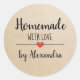 Moderner Aufkleber "hausgemacht mit Liebe" mit schwarzem Schriftart auf einem Pappboden, der durch ein niedliches rotes Herz geschmückt ist. Text anpassen.