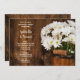 Einladend zu einem Party in der Vorehe, das die Braut und den Bräutigam mit dem charmanten Holzbuckel von White Daisies Country Wedding Probe Dinner lädt. Dieses lässige und dennoch elegante Party im rustikalen Stil eines Bauernhauses lädt zum gemütlichen Abendessen ein. Die blühende Blume aus einem Holzeimer mit blühenden weißen und einem verwitterten Braunholzhintergrund wurde digital verbessert.