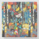 In einem lebendigen Birkenwald steht eine Katzenkatze mit geometrischem, farbigem Glas. Der Hintergrund ist eine farbenfrohe Mischung aus Herbstblättern und Blautönen und Gelben. Digital Art Fotoshop