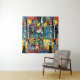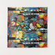 In einem lebendigen Birkenwald steht eine Katzenkatze mit geometrischem, farbigem Glas. Der Hintergrund ist eine farbenfrohe Mischung aus Herbstblättern und Blautönen und Gelben. Digital Art Fotoshop