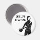 Ein schwarzer Vektor eines schlanken und passenden Männchens, der mit einem Kettlebellgewicht aufsteigt. Für die Konturen wird negativer Platz verwendet. Der Text lautet "One Lift at a Time", was eine Erinnerung ist, dass es keine Abkürzung zur Fitness gibt und schlank und gut aussieht. Eine Veränderung ist nur möglich, wenn alle Anstrengungen unternommen werden. Sie können auch auf Ihre eigene Nachricht personalisieren.