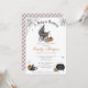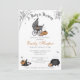 Ein skurriles, handgezeichnet Halloween "A Baby is Brewing" geschlechtsneutrales Babyduschdesign in schwarzer Tinte. Das antike Baby-Kutschen, die schwarze Krähe, der Kessel, der Hexenhut, Kürbisse und Spinnweben auf einem knusprigen weißen Hintergrund. Die Rückseite weist ein niedlich orangefarbenes und lila Gingham-Muster auf.