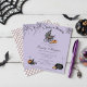 Ein skurriles, handgezeichnet Halloween "A Baby is Brewing" geschlechtsneutrales Babyduschdesign in schwarzer Tinte. Das antike Baby-Kutschen, die schwarze Krähe, der Kessel, der Hexenhut, Kürbisse und Spinnennetze auf einem lila Hintergrund. Die Rückseite weist ein niedlich orangefarbenes und lila Gingham-Muster auf.