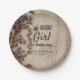 Ein Babymädchen brütet eine rustikale Kaffeemaschi Pappteller