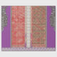 Das Design zeigt ein sehr detailliertes Stoffmuster. Hier eine Zusammenstellung der Elemente: ・ Zentrales Design: Ein kühner lila Streifen ist der Brennpunkt, flankiert von komplexen, symmetrischen weißen Mustern auf grauem Hintergrund. ・ Umgebung: Kleinere, sich wiederholende Motive in einem bräunlichen Farbton vor einem leichteren Hintergrund, die möglicherweise auf Kleider oder Stickereien hinweisen. ・ Grenzen: Das Muster wird durch ein anderes detailliertes, weißes und graues Design begrenzt, das dem zentralen ähnelt, aber in kleinerem Maßstab ist.