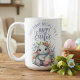 Diese Osterweide-Tasse ist mit einem kleinen, kleinen, weißen Hasen mit gemalten Ostereiern und einem Strauß mit pastellfarbenem Blumengrün ausgestattet. Der Text oben erklärt "Einige Bunny wünscht euch ein glückliches Osterfest" in einem zauberhaften, pastellvioletten Dekorationsskript.