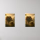 Ein edler, erwachsener Stegosaurus, der sein junges, spielerisches Schlüpfen sanft durch ein sonnenverwinkeltes prähistorisches Tal führt, umgeben von strahlendem goldenen Licht aus der tief hängenden Sonne. Der erwachsene Stegosaurus rühmt sich einer Reihe von massiven, blätterähnlichen Tellern entlang seiner Wirbelsäule, die leicht von Bronze- und Moosgrün schimmern, während sein gepanzerter Schwanz sich protektiv hinter sich bewegt. Das Baby, mit weicheren Tellern und Rutschfunktionen, imitiert kühn seine Eltern, tritt durch flache Schwimmbecken und schnüffelt die Farne neugierig. Das Tal ist reich an urzeitlicher Vegetation: gewaltige Zykaden, schwingende Baumfarne und moosbedeckte Stämme. Nebel erhebt sich aus nahegelegenen heißen Quellen, während Pterosaurier-Herden still über den leuchtenden Himmel treiben. Das Terrain leuchtet mit dem warmen Licht der Dämmerung und wirft lebendige Schatten aus, die sich über das Land erstrecken. Die Atmosphäre vermittelt eine Mischung aus uralter Ruhe und elterlicher Bindung.