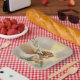 Ein Engel im Himmel, der Weihnachten Teller zu Weihnachten hält.