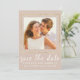 Elegantes und elegantes Gold, Rose und Elfenbeinfarben. Ihr Foto ist umgeben von einem goldenen Rahmen mit einem modernen Elfenbeinweiß-Punktmuster. Save the Date ist in einem schönen Skript-Schriftart geschrieben. Ihre Namen, Hochzeitstermin und Ort folgen. Die Rückseite der Postkarte ist mit dem gleichen weißen Punkt auf dem Farbmuster eingerückt. Ihre Hochzeitsdetails befinden sich auf dem Hintergrund, der auch von einem goldenen Rahmen umgeben ist.