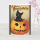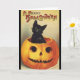 Vintage Illustration Halloween Urlaubsdesign mit einem niedlichen schwarzen Kätzchen. Die glückliche Katze sitzt in einem Jack-oder-Laternen Kürbis, der mit einem Lächeln auf seinem Gesicht geschnitzt ist. Ein frohes Halloween von Ellen Clapsaddle.