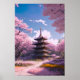 Die hölzerne Pagode liegt hoch inmitten eines wunderschön gefärbten Gartens mit rosa und gelben Blumen, die einen lebhaften und farbenfrohen Vordergrund bilden. Die atemberaubenden Sakurabäume verleihen der Szene eine Touch von Eleganz und Charme und schaffen eine wirklich bezaubernde Atmosphäre. Dieses Plakat ist perfekt für jeden, der Natur und Kunst Liebe, und wird jedem Wohnraum eine Touch von Schönheit und Eleganz verleihen.