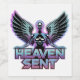 Ein glänzender, metallischer Chrom-Engel mit kühnen Stammesflügeln, umgeben von glitzernden holografischen Effekten, Neonakzenten. Y2K Stil Design mit Heavan gesendet Text.