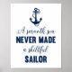 "Ein glattes Meer hat nie einen geschickten Seemann gemacht", inspirierende Zitat-Kunst in Marineblau und Weiß. Dieses nautische Zitat-Poster schafft eine coole Atmosphäre in Ihrer Zuhause und ist ein Geschenk für Ihre Freunde!