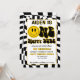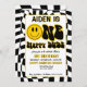 Ein Happy Typ Retro-Schachbretts 1. Geburtstag Party Einladung Vorlage, Jungen 1. Geburtstag Party Einladungen, Retro Groovy Party, Schwarz-weißes und gelbes Retro-Party Thema, Retro-Schachbretts, Hippie Geburtstagsfeier Einladungen