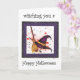 Aquarellmalerei auf einer Hexenhut und Besen auf einer Karte, die "Witching you a Happy Halloween" heißt