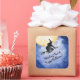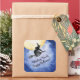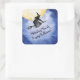 Fun Aquarell Hexe fliegt auf ihrem Besen ist alle bereit, "Hexe" Ihnen ein glückliches Halloween. Aquarellblauer Himmel, Vollmond und fliegende Hexenblume Silhouette. Großartiger Aufkleber für Ihre Umschläge, Einladungen und Karten.