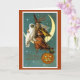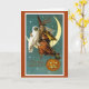 In diesem Vintage-Bild haben wir eine Hexe mit ihrer ziemlich großen, weißen Eule, die auf einem Halbmond sitzt, der mit einem leuchtenden Jack-O-Lantern aufgehängt wurde.