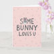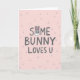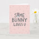 Dieses Design zeigt einen pastellrosa Hintergrund mit großen, abgerundeten serifenlosen Buchstaben in Weiß, die „SOME BUNNY LOVES U“ lesen, was der Nachricht einen süßen, freundlichen Ton gibt 🐰. Die Wörter sind zentriert und nehmen den meisten Platz ein, wobei der Ausdruck so gestapelt ist, dass er nah und gemütlich wirkt, wie eine Notiz, die für jemanden Besonderes gedacht ist. Im Wort „SOME“ wird das „O“ durch ein einfaches Hasengesicht ersetzt, als ob der Hase mit einem sanften, liebevollen Blick in die Nachricht schaut. Der Hase ist mit einem runden weißen Gesicht, winzigen schwarzen Punkt-Augen, einer kleinen Nase, schwachen Schnurrhaaren und hohen Ohren mit weichen rosa Innen-Details gezeichnet 🐇. Um die Schrift herum sind kleine blassgraue fünfzackige Sterne locker verstreut, was eine leichte, traumhafte Note hinzufügt, ohne die Aufmerksamkeit von den Wörtern abzulenken. Die begrenzte Farbpalette aus blassem Rosa, weichem Grau und