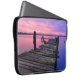 Ein hölzerner Pier in einem See, während der Sonnenuntergang einen rosa Himmel herstellt.