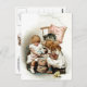 Ein interessantes Spiel. Zwei kleine Mädchen mit Puppen spielen Karten, während ihre Katze neben sich sitzt und das Spiel mit eifrigem Interesse verfolgt. Niedliche Vintage Illustration von Harriett Bennett.