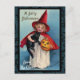 Diese Vintage Abbildung des frühen 19. Jahrhunderts zeigt ein kleines Mädchen in einem weißen Nachthemd, Hut und Kap der roten Hexe mit einer schwarzen Katze und Jack-oder-Laterne. Der Titel oben wünscht allen "A Jolly Halloween". Das Hintergrundbild ist ein Nachthimmel mit einem Vintagen, schwarzen Spitzen-Overlay. Personalisieren Sie Ihre Daten mit Ihrem Namen oder einer speziellen Nachricht.