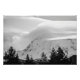 Ein Schwarz-Weiß-Foto des Berges Rainier. Im Vordergrund stehen Bäume. Auf der Spitze des schlafenden Vulkans bilden sich lockenförmige Wolken, die den umliegenden Himmel füllen. Image Copyright ©2023 Kimberly J Tilley. zazzle.com/store/developingnature
