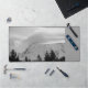 Ein Schwarz-Weiß-Foto des Berges Rainier. Im Vordergrund stehen Bäume. Auf der Spitze des schlafenden Vulkans bilden sich lockenförmige Wolken, die den umliegenden Himmel füllen. Image Copyright ©2023 Kimberly J Tilley. zazzle.com/store/developingnature