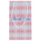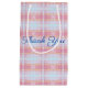 Eine kleine, rosa karierte Geschenktasche mit hellblauem Hintergrund. Der dunkelblaue Dankeschön-Text kann auf einen beliebigen Namen umgestellt werden, oder Text ist abnehmbar. Der helle, bläuliche Hintergrund kann auf eine beliebige Farbe umgeschaltet werden, um dem eigenen Stil zu entsprechen.