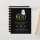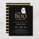 Einfache und moderne Halloween Baby Shower Einladung mit einem niedlichen Geist, der einen Babykürbis auf schwarzem Hintergrund hält. Mit den Worten " ein kleines Boo ist fast fällig " und Streifen pastellfarben orange und schwarz umgekehrt. Bereit für einfache Personalisierung.
