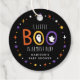 Niedliche Babydusche-Lieblingsmarken im Halloween-Thema mit der Phrase "Ein kleines Boo ist fast fällig" in Orange, Gelb und lila Handschrift mit weißen Geistern auf schwarzem Hintergrund. Farbenfrohe Sterne und Punkte umkreisen das Design. Personalisieren Sie die Halloween Baby Dusche Liebesmarken mit dem Namen der zukünftigen Mutter. Das Gefälligkeitstempo kehrt sich um, um ein passendes Sternmuster anzuzeigen.