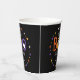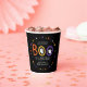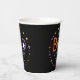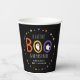 Niedliche Babyduschbecher mit Halloween-Thema und der Phrase "Ein kleines Boo ist fast fällig" in orangefarbenen, gelben und lila Handschriften mit weißen Geistern auf schwarzem Hintergrund. Farbenfrohe Sterne und Punkte umkreisen das Design. Personalisieren Sie die Halloween Baby Dusche Papiertassen mit dem Namen der künftigen Mutter.