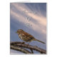 Ein Bild eines kleinen braunen Vogels (Spatz oder Spinne), der auf einem Zuhause-Stuhl sitzt, der aus Baumzweigen auf unserem Deck gebaut ist. Der Himmel hinter dem Vogel ist blau mit weich weißen Wolken.